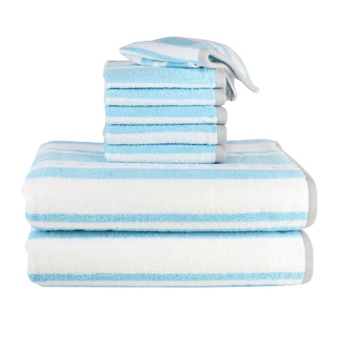 The bath towel, hand towel, and washcloth are all adorned with narrow blue stripes. Shop wayfair for all the best striped bath towels. Black white stripes hand towels small decorative bath towels ultra soft highly absorbent bathroom towel personalized microfiber fingertip washcloth custom striped guest towel. Blue and white stripe our organic cotton bath towel with jaunty, classic style. Hanger loop at top edge and tassels at lower edge.